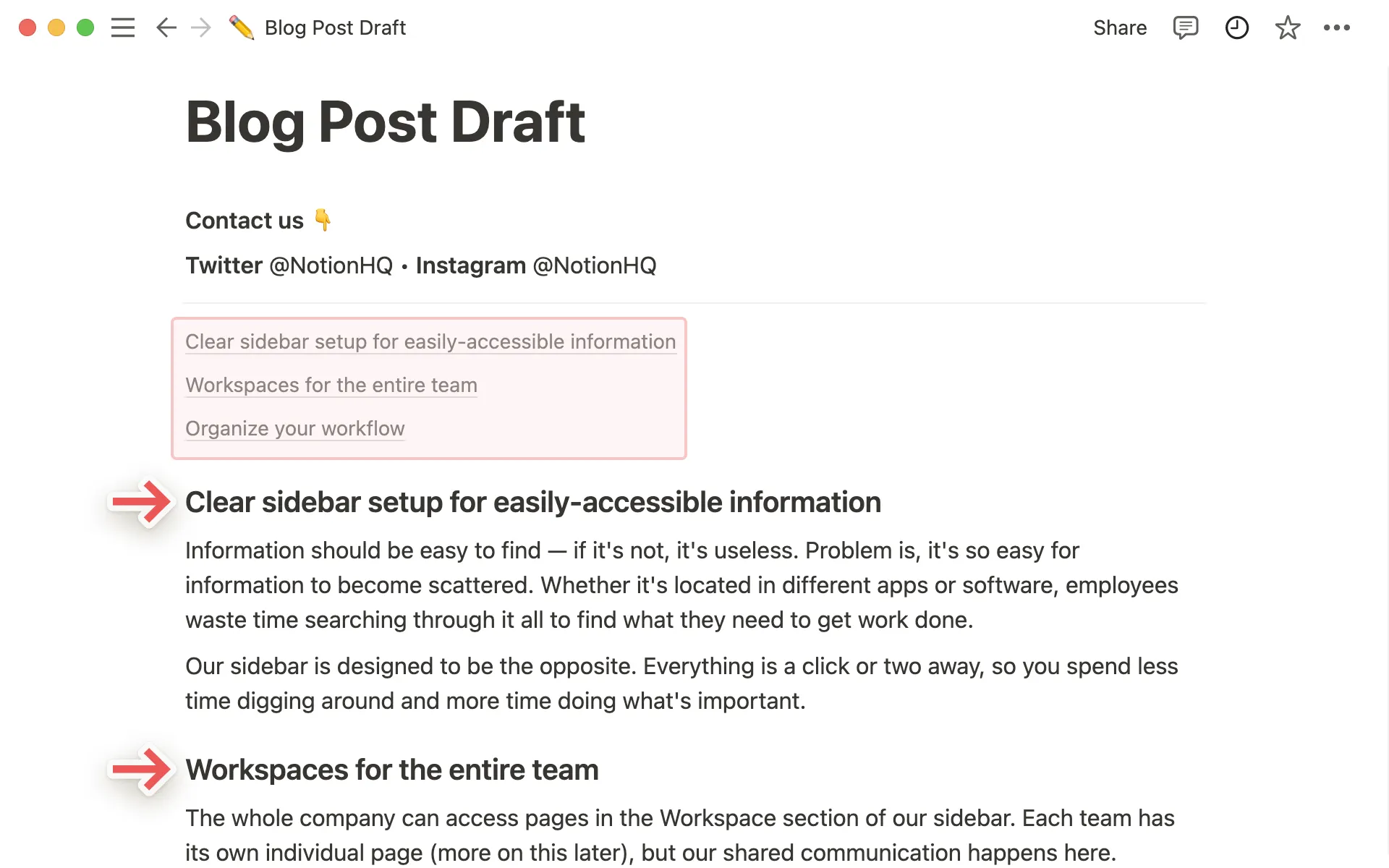 페이지 내용을 완성하기 전에 목차를 먼저 추가할 수 있습니다. 처음엔 비어있지만, 페이지가 완성되어가면서 따라 점차 채워질 거예요.