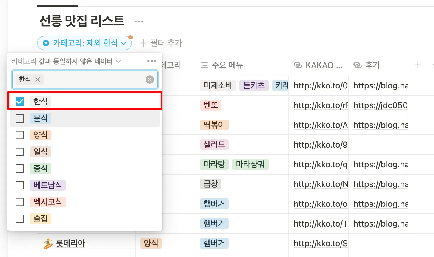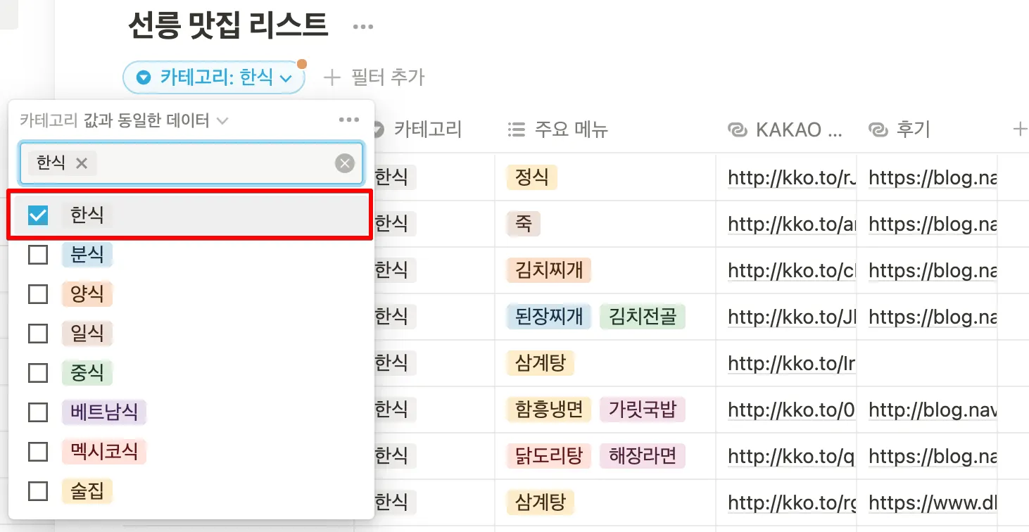 나타난 옵션 중에 원하는 옵션을 클릭하면 선택한 데이터만 보여집니다. 여기서는 한식을 클릭해볼게요, 추가하고 싶은 옵션을 선택하면 선택한 옵션이 추가로 보여집니다.