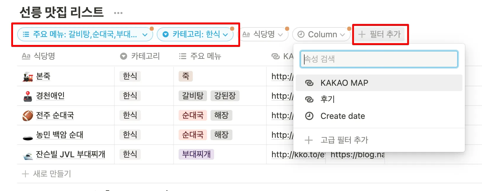 보기를 추가하고 갤러리 보기를 추가한 후 한식과 분식만 필터링 해보세요.