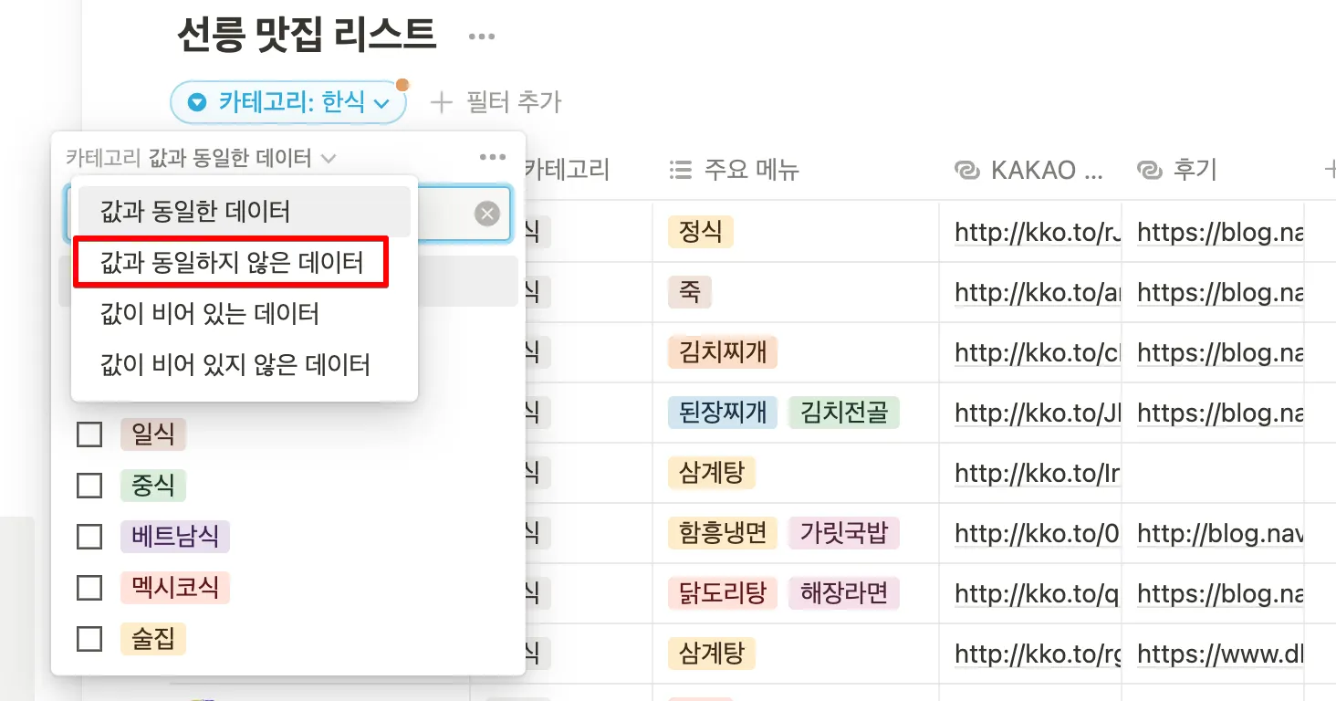 조건 : 값과 동일하지 않은 데이터, 옵션 : 한식을 선택했기 때문에