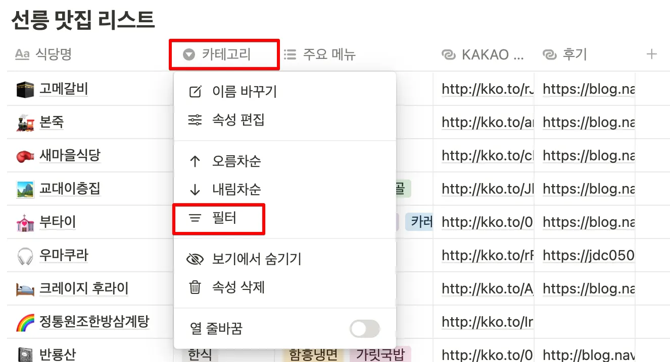 자료 정리하는 방법에서 만들었던 선릉 맛집 리스트를 가져와 필터에 대해 배워보죠.