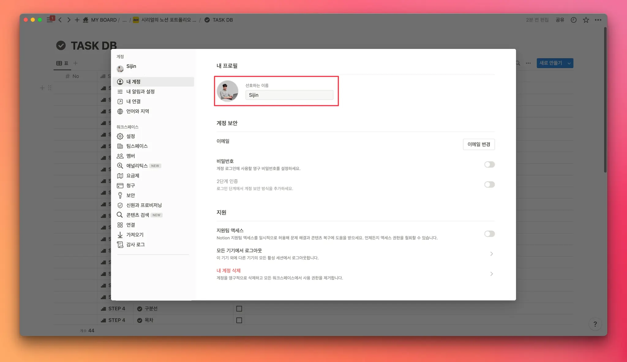 왼쪽 사이드바 → 설정과 멤버 → 내 계정에 들어갑니다.
