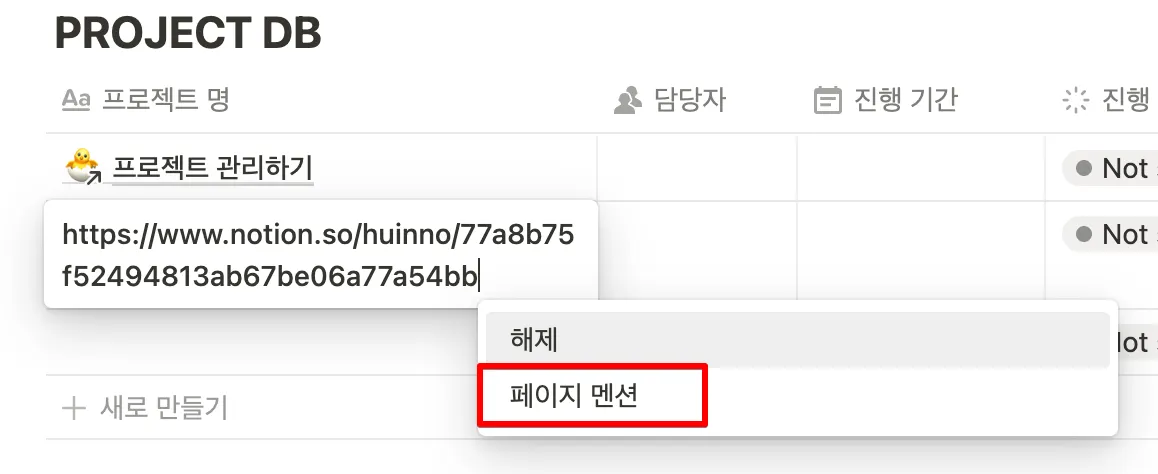 데이터베이스의 제목 속성에는 기본적으로 텍스트 속성으로 되어 있으며, 다른 페이지의 링크를 복사해 붙여 넣고 페이지 멘션을 선택하면 다른 페이지와 연결할 수 있습니다.