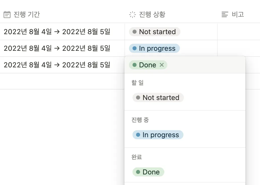프로젝트 관리의 기본은 프로젝트가 진행 중인 상황을 파악하는 것입니다. 상태 속성으로 만든 곳을 클릭해보면 할 일, 진행 중, 완료로 된 그룹이 들어있고, 그룹에 있는 속성을 선택하면 진행 상황을 체크할 수 있습니다.