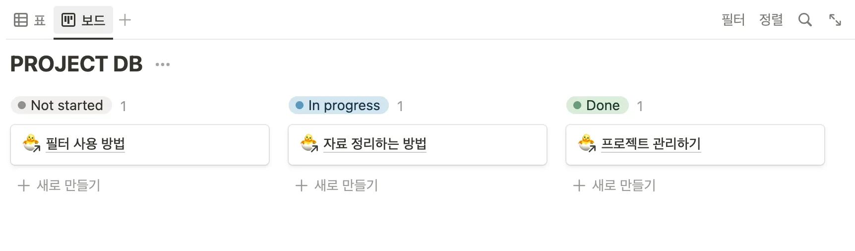 상태 속성을 만들었으면 보드 보기를 만들어 데이터 모양을 변경해보세요. 시각화된 모습으로 더 빠르게 자료나 진행 상황을 파악할 수 있습니다.