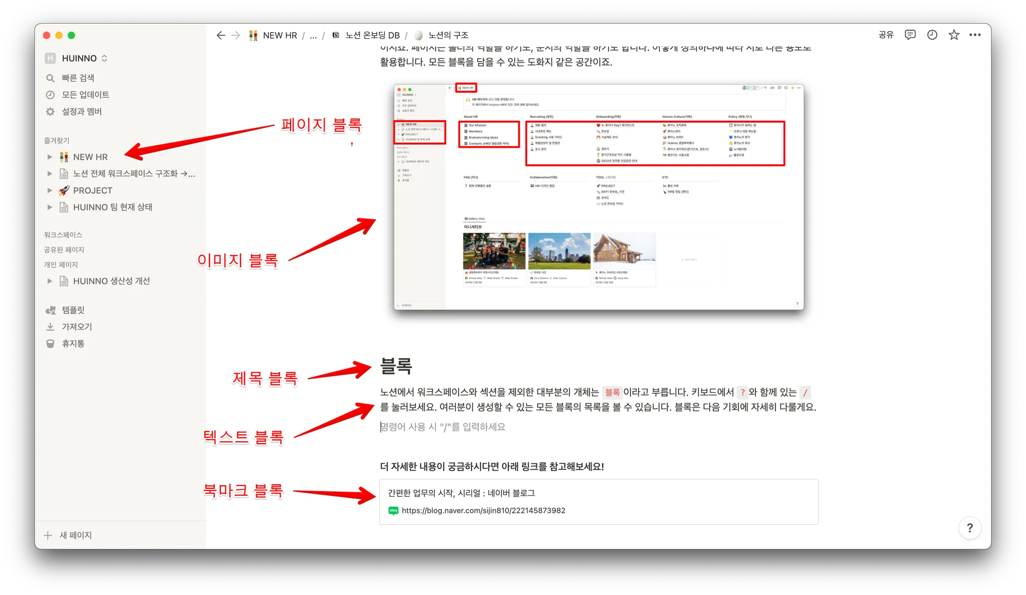 노션에서 워크스페이스와 섹션을 제외한 대부분의 개체는 블록이라고 부릅니다.