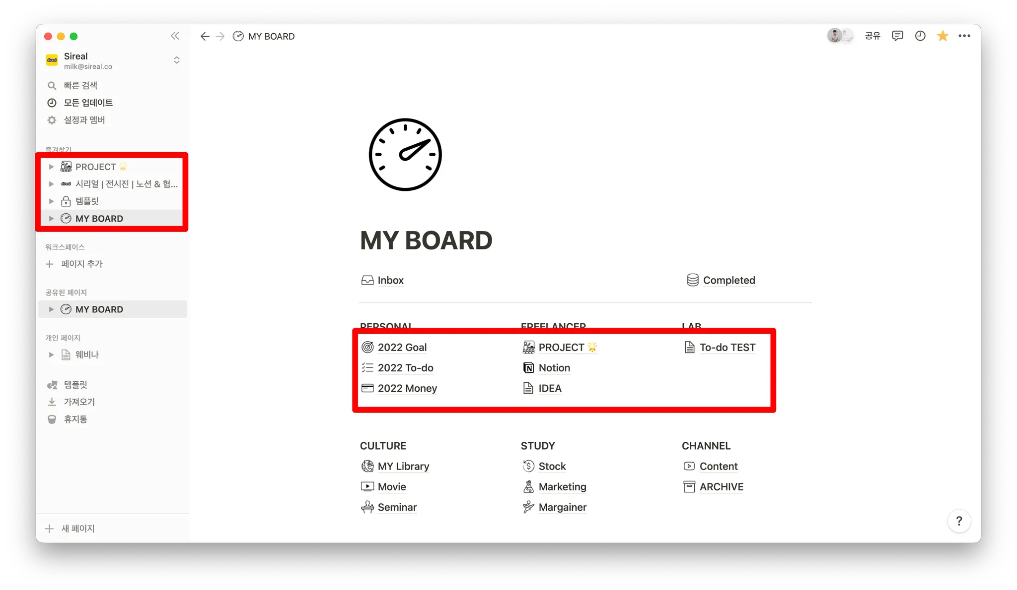 왼쪽 사이드바에 있는 것들도, 템플릿, MY BOARD에 있는 것들도 모두 페이지죠. 페이지는 폴더의 역할을 하기도, 문서의 역할을 하기도 합니다. 어떻게 정의하냐에 따라 서로 다른 용도로 활용합니다. 모든 블록을 담을 수 있는 도화지 같은 공간이죠.