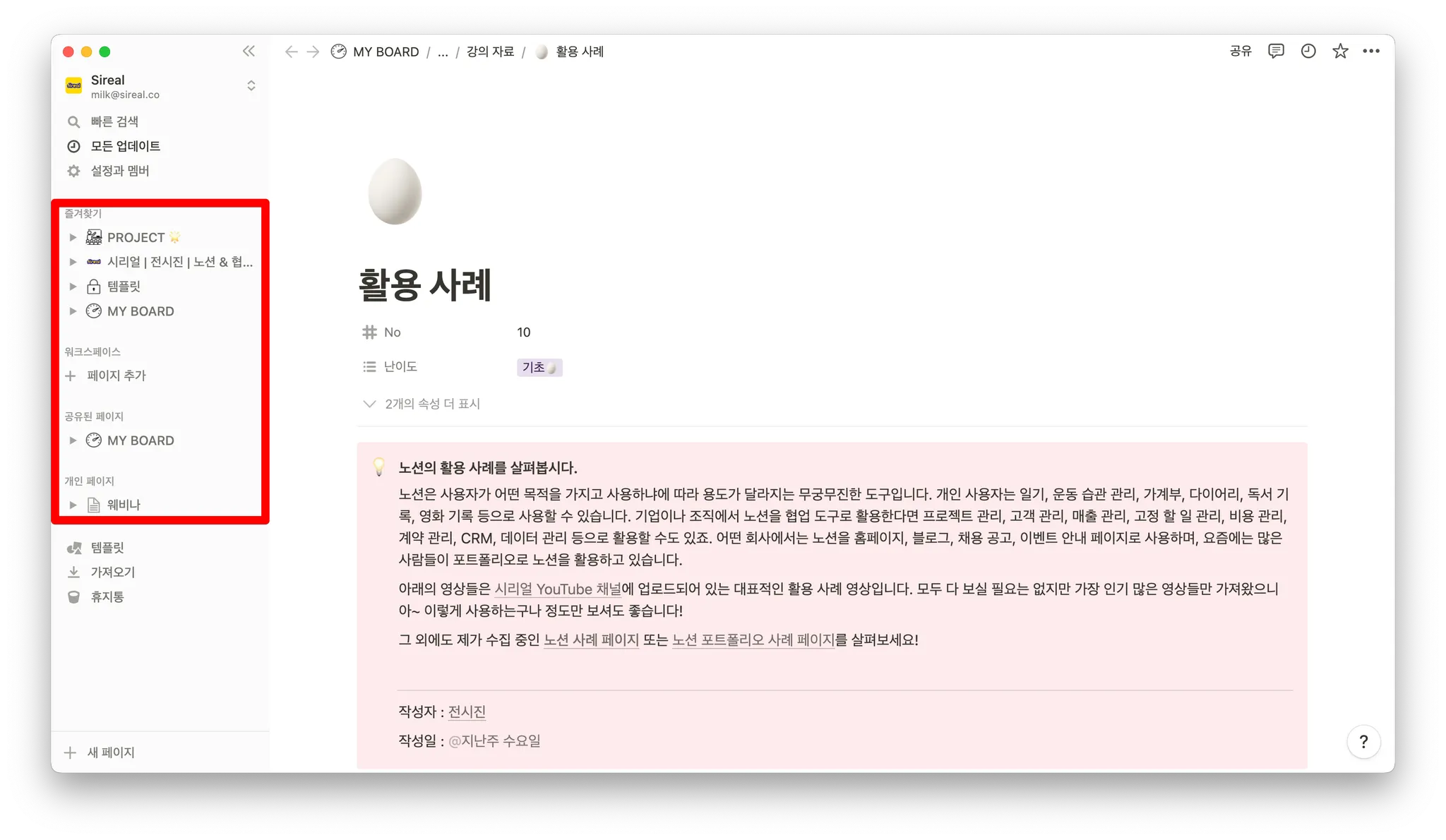 섹션은 내가 즐겨찾는 페이지와, 공유 권한에 따라 나누어집니다. Sireal은 팀 요금제를 사용하고 있기 때문에 워크스페이스 섹션이 나타나, 멤버 권한으로 들어오는 모든 사람은 워크스페이스 섹션에 있는 모든 페이지에 접근할 수 있습니다.