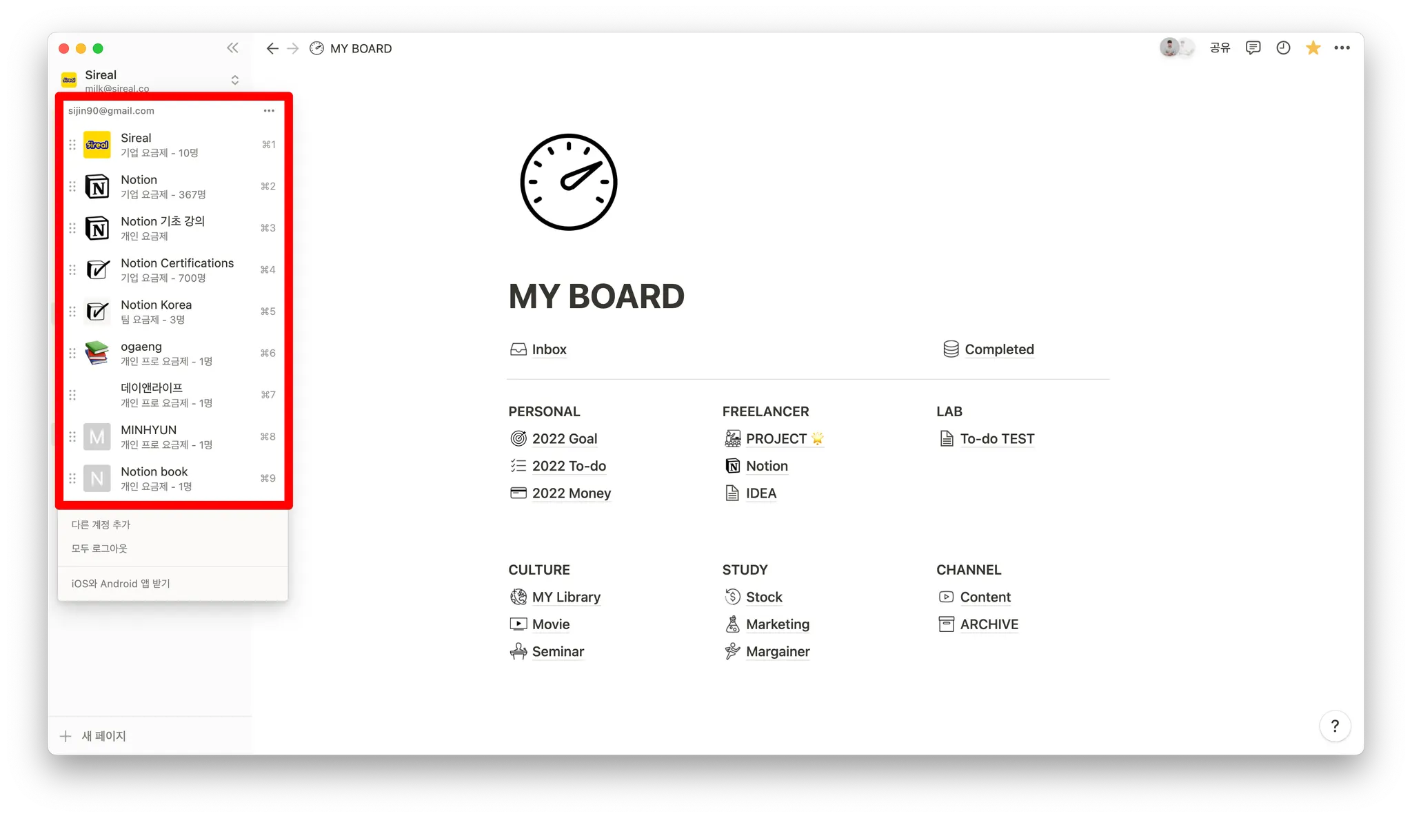 우리가 하나의 명의로 여러 건물을 살 수 있는 것처럼, 노션은 하나의 계정으로 여러 워크스페이스에 들어갈 수 있습니다.