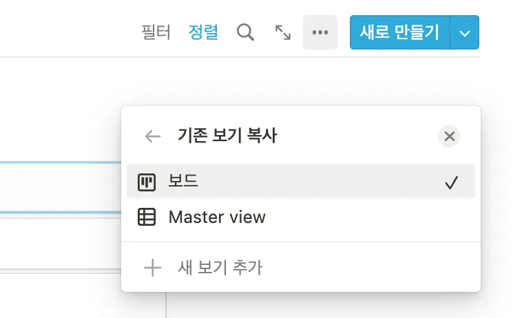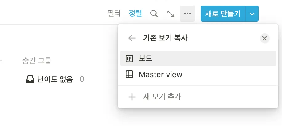 기존에 만들어진 데이터베이스 내 원하는 보기를 선택한 후, 다른 보기, 필터, 정렬을 추가합니다.