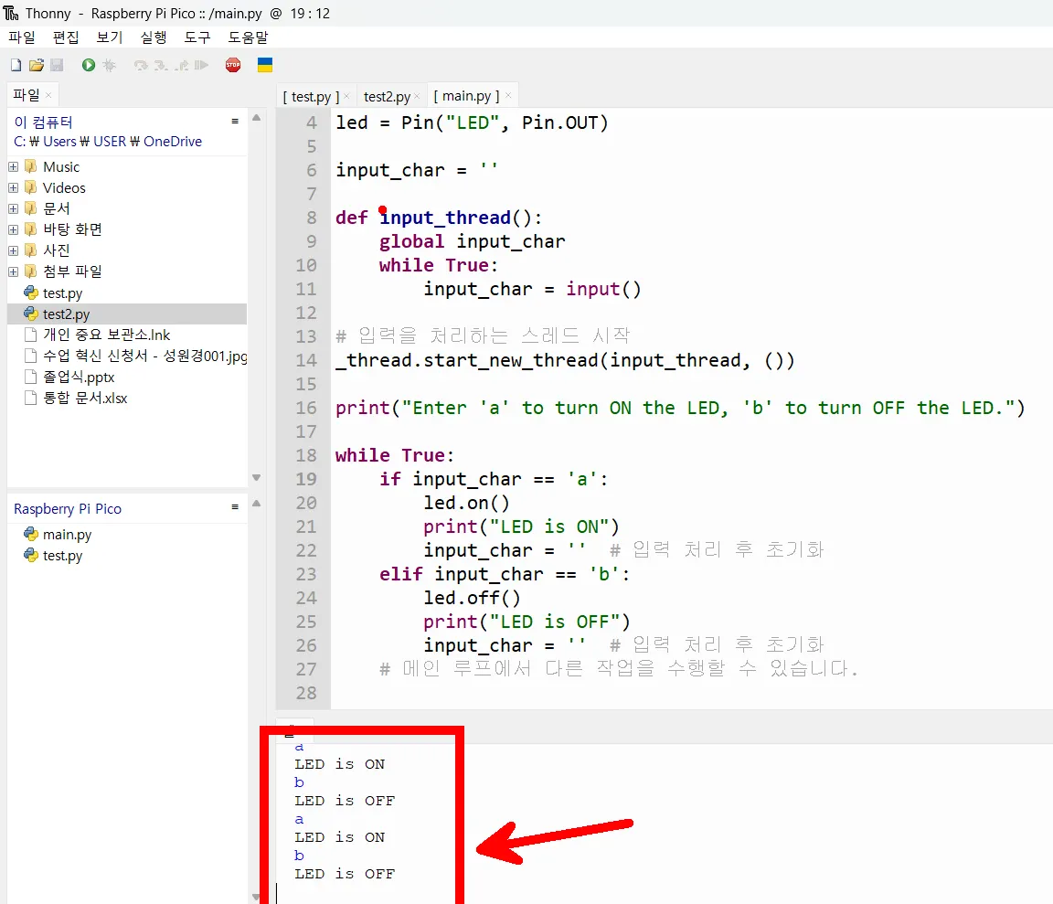 from machine import Pin import _thread led = Pin("LED", Pin.OUT) input_char = '' def input_thread(): global input_char while True: input_char = input() # 입력을 처리하는 스레드 시작 _thread.start_new_thread(input_thread, ()) print("Enter 'a' to turn ON the LED, 'b' to turn OFF the LED.") while True: if input_char == 'a': led.on() print("LED is ON") input_char = '' # 입력 처리 후 초기화 elif input_char == 'b': led.off() print("LED is OFF") input_char = '' # 입력 처리 후 초기화 # 메인 루프에서 다른 작업을 수행할 수 있습니다.
