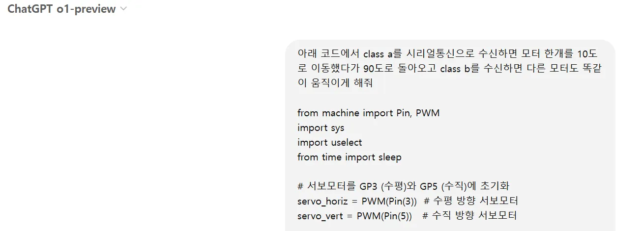 print("서보모터 제어: 시리얼 통신으로 'class a' 또는 'class b'를 포함한 메시지를 보내세요. 종료하려면 Ctrl+C를 누르세요.")