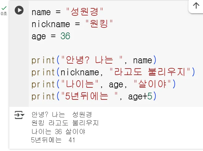 name이란 변수를 만들고 “성원경” 이란 문자 데이터를 넣었다.