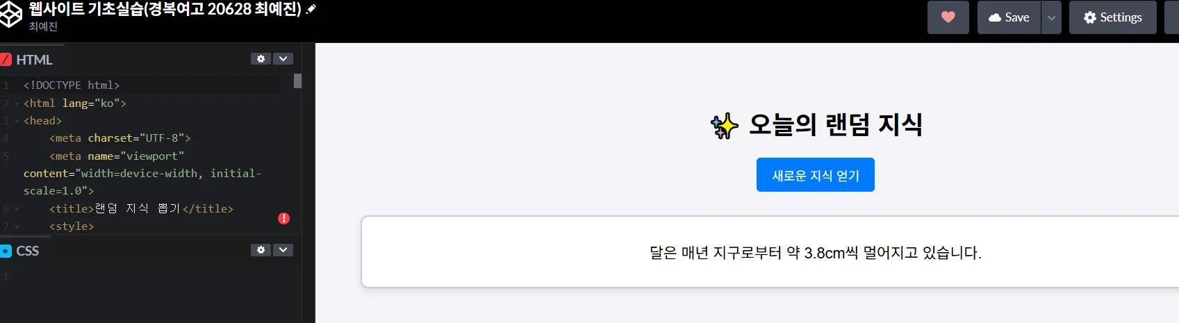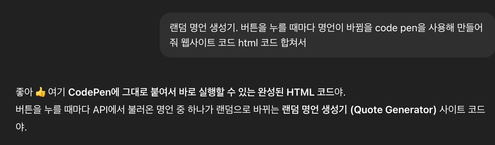소감:이 랜덤 명언 생성기 만들면서, 간단하지만 사용자 경험을 신경 쓴 게 마음에 들었다. API에서 실시간으로 명언을 받아오고, 익명 대신 작가 이름 있는 명언만 보여주니까 더 신뢰감도 생기고 멋져 보이고. 복사나 공유 기능도 있어서 실제로 쓸 때 편리하고, 디자인도 세련돼서 사용하기 좋았다. 이렇게 작은 과제로도 재미있게 웹 개발 감각을 키울 수 있다는 걸 다시 느꼈다.