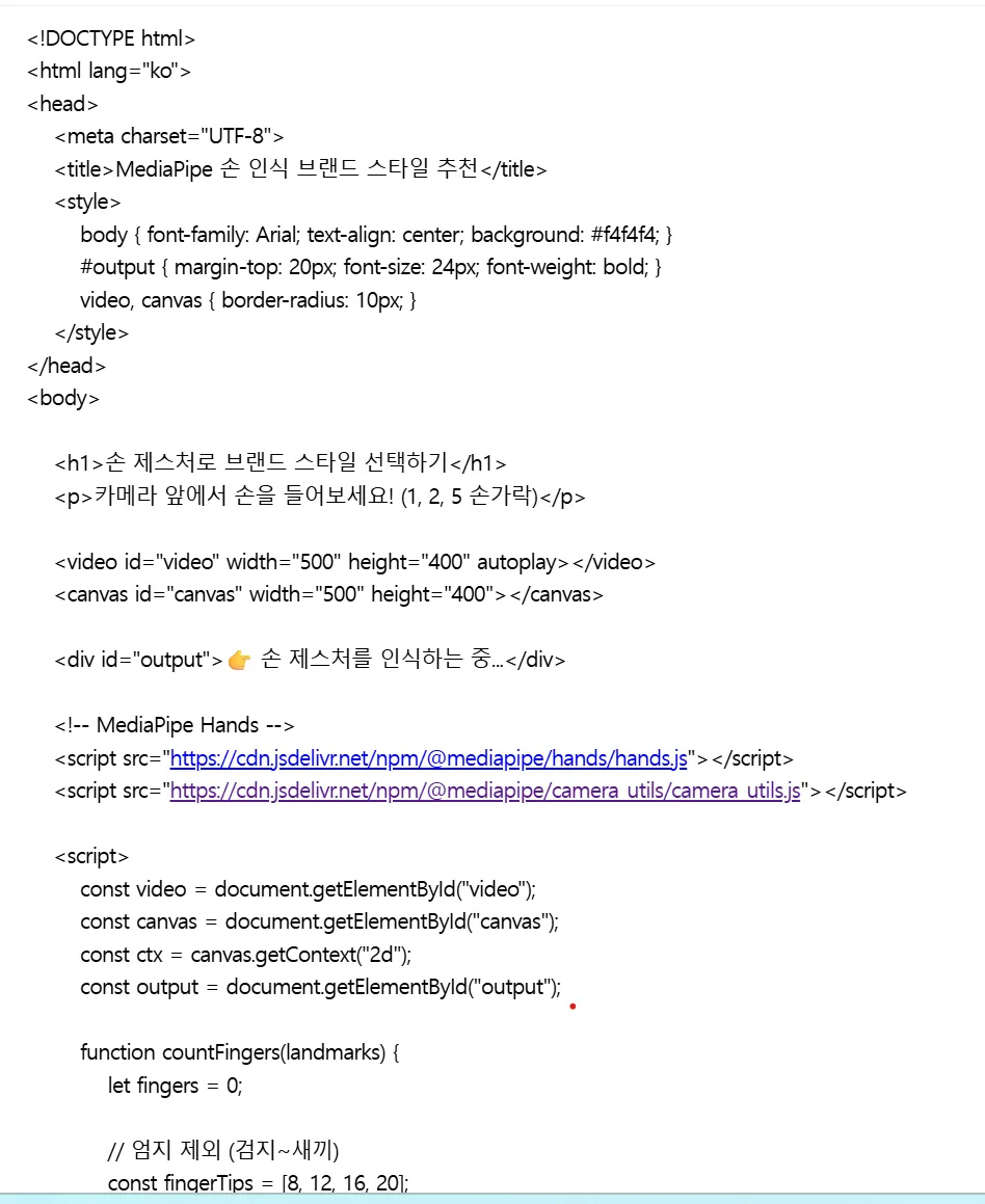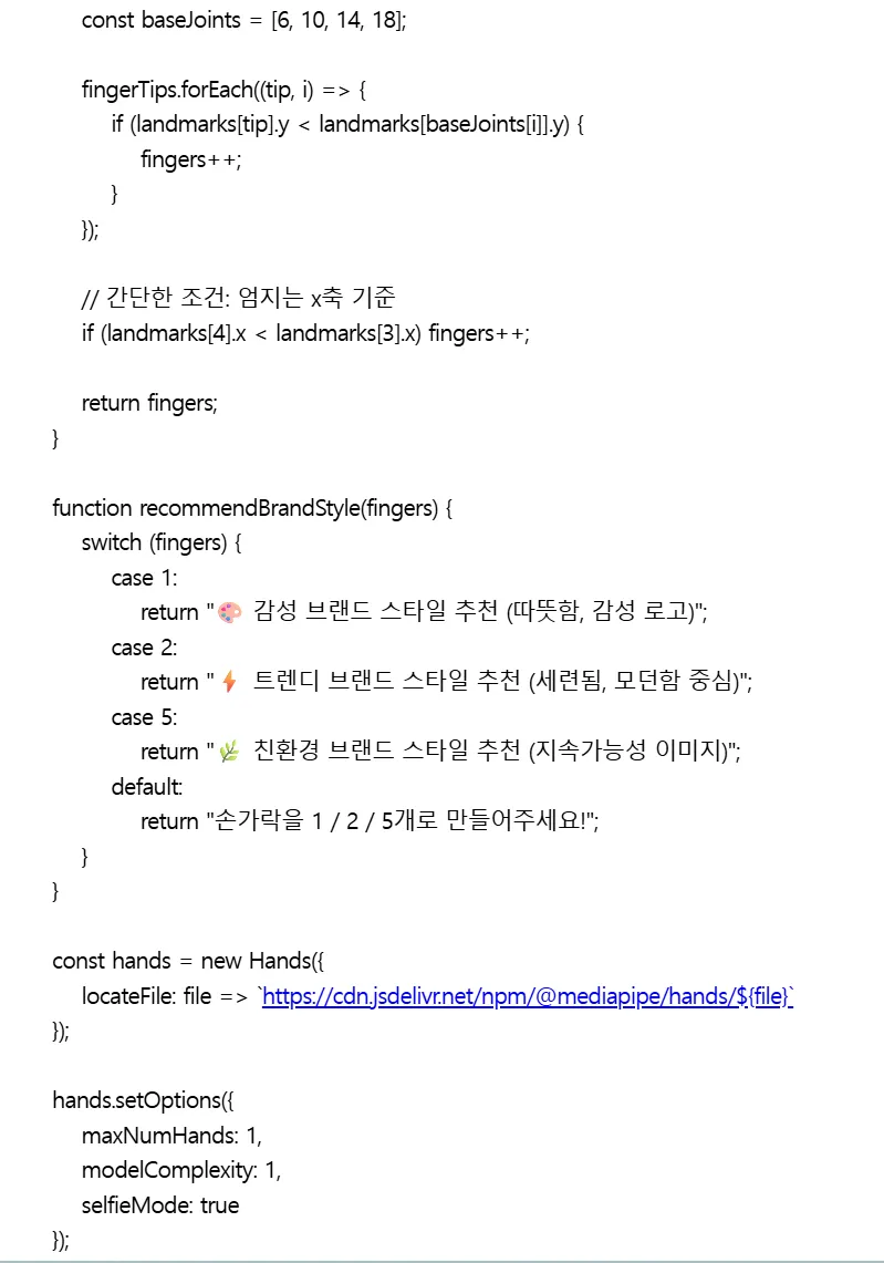 간단한 설명: 이 웹사이트는 미디어파이프 AI를 사용해 손가락 개수를 실시간으로 인식하고 그 제스처에 따라 브랜드 스타일을 추천해주는 서비스이다. 사용자는 1, 2, 5개의 손가락을 들어서 감성, 트렌디, 친환경 브랜드 콘셉트를 선택할 수 있고 손 제스처로 브랜드 아이디어를 빠르게 탐색해보는 경험을 하게 해준다.