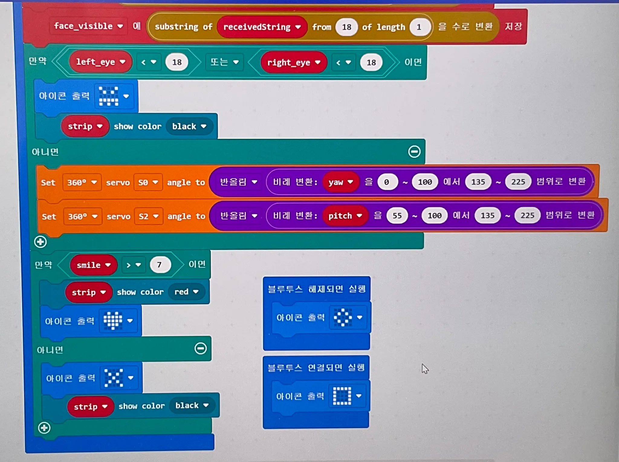 브랜드매니저라는 나의 진로와 연관된 주제를 생각하다가 고객 반응을 분석하는 프로젝트를 하기로 정하였다. 마빗과 미디어 파이프를 활용해 제작하였다. 선생님의 도움을 받아 레고를 제작하고 코딩을 설계하였다. 먼저 미디어 파이프와 마빗 코딩 화면을 번갈아가면서 비례 변환의 pitch를 설정하였다. 이것으로 얼굴 방향을 따라오도록 만들었다. 만약 블록과 아이콘 출력 등의 블록을 활용해 미소를 지으면 하트 LED와 빨간 불빛이 나온다는 것을 설계하였다. 마지막으로 미디어 파이프 화면을 번갈아가면서 눈의 깜빡이는 정도를 구하였다. 그리고 그것을 대입해 한쪽 눈을 감으면 화난 표정이 나오도록 구현하였다.