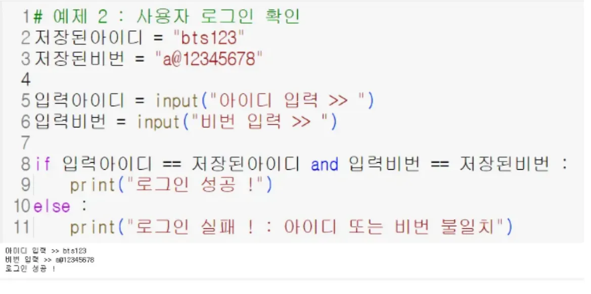아이디 조건과 비번조건이 and로 묶여서 둘다 같을 때만 로그인 성공 이 출력된다.