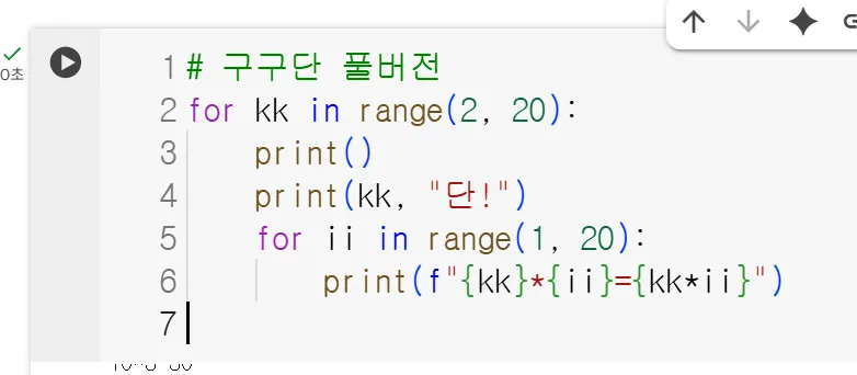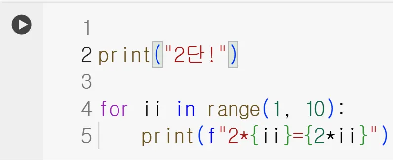 구구단 코드에서 ii가 1부터 9까지 커지면서 계산값을 출력하였다.