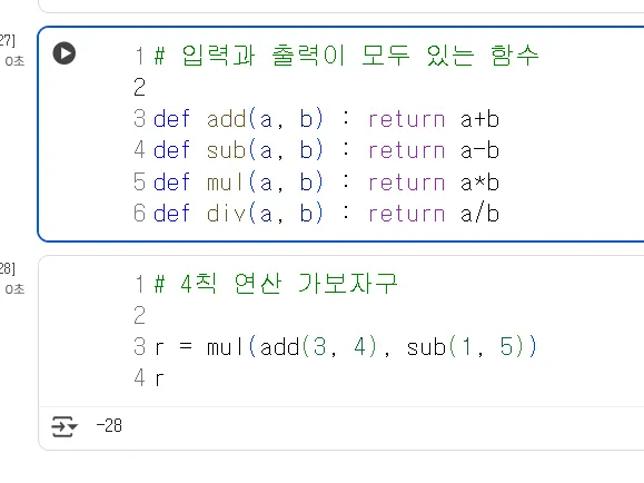 각 사칙연산의 함수의 출력인 다른 연산의 입력이 되어서 결과값이 나왔다.