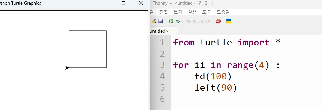 done() 또는 mainloop(): 그리기가 완료된 후 창이 닫히지 않도록 유지