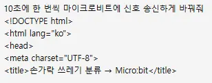또한, chatGPT가 만들어준 html 코드를 보면 마이크로비트로 “종이” “플라스틱” 등 한글을 전송하도록 되어있었는데, 더 간편하게 a, b의 한 문자 알파벳으로 전송하게 하고 싶어서 조건문으로 직접 수정하였다.