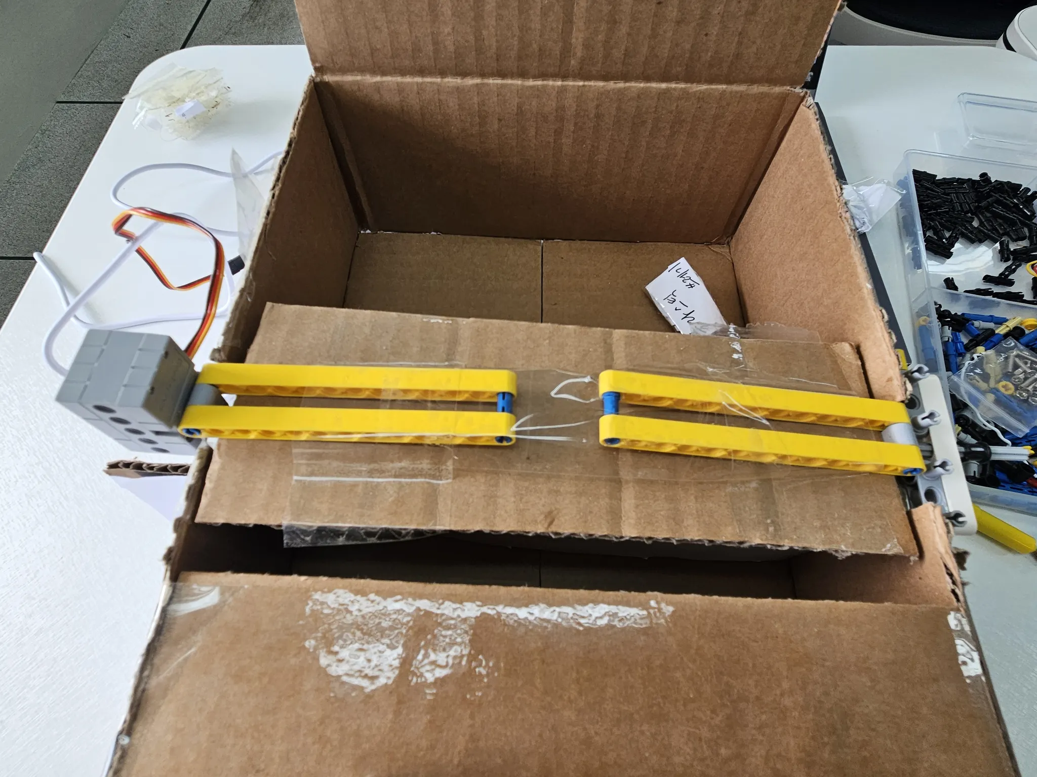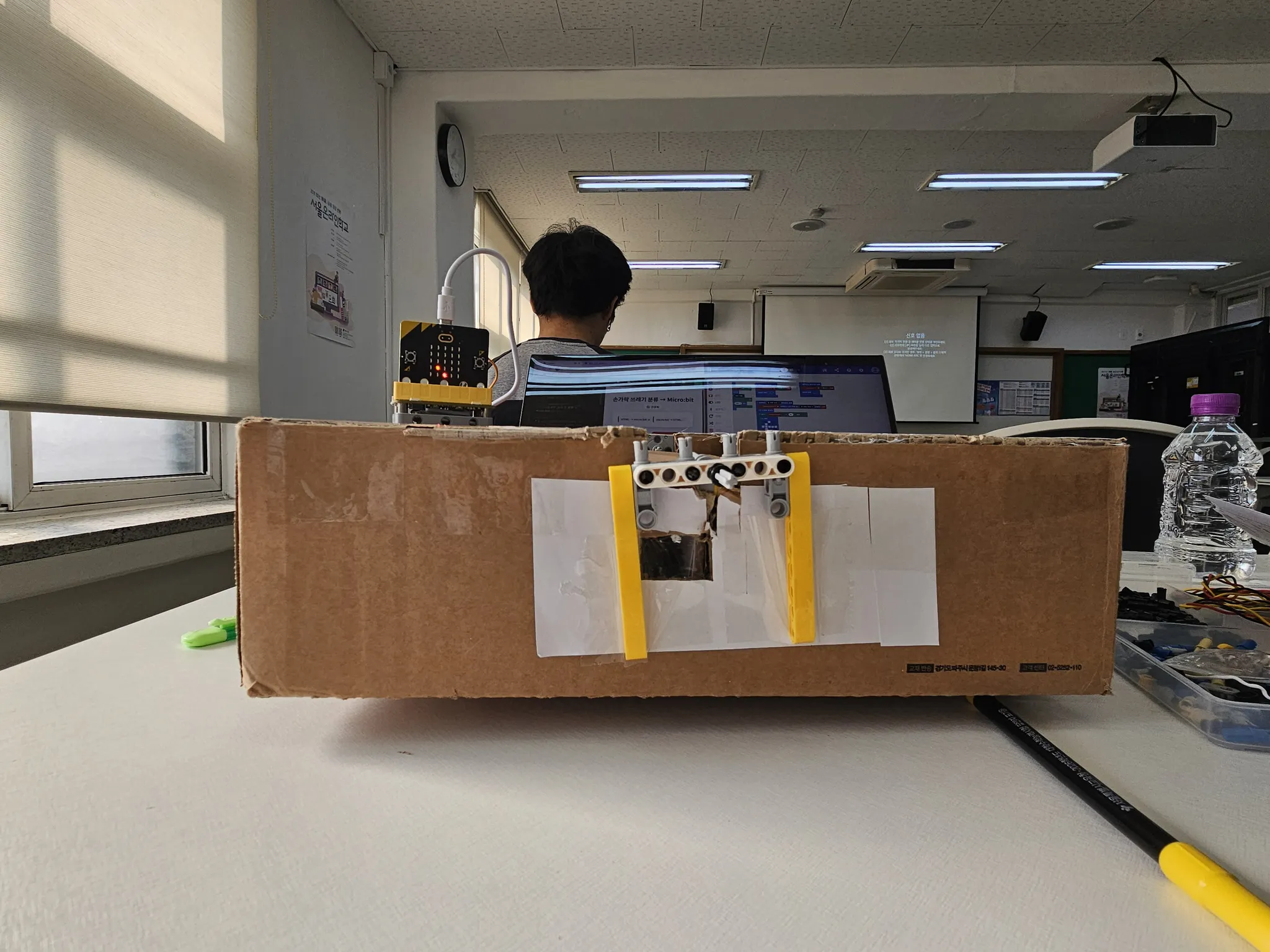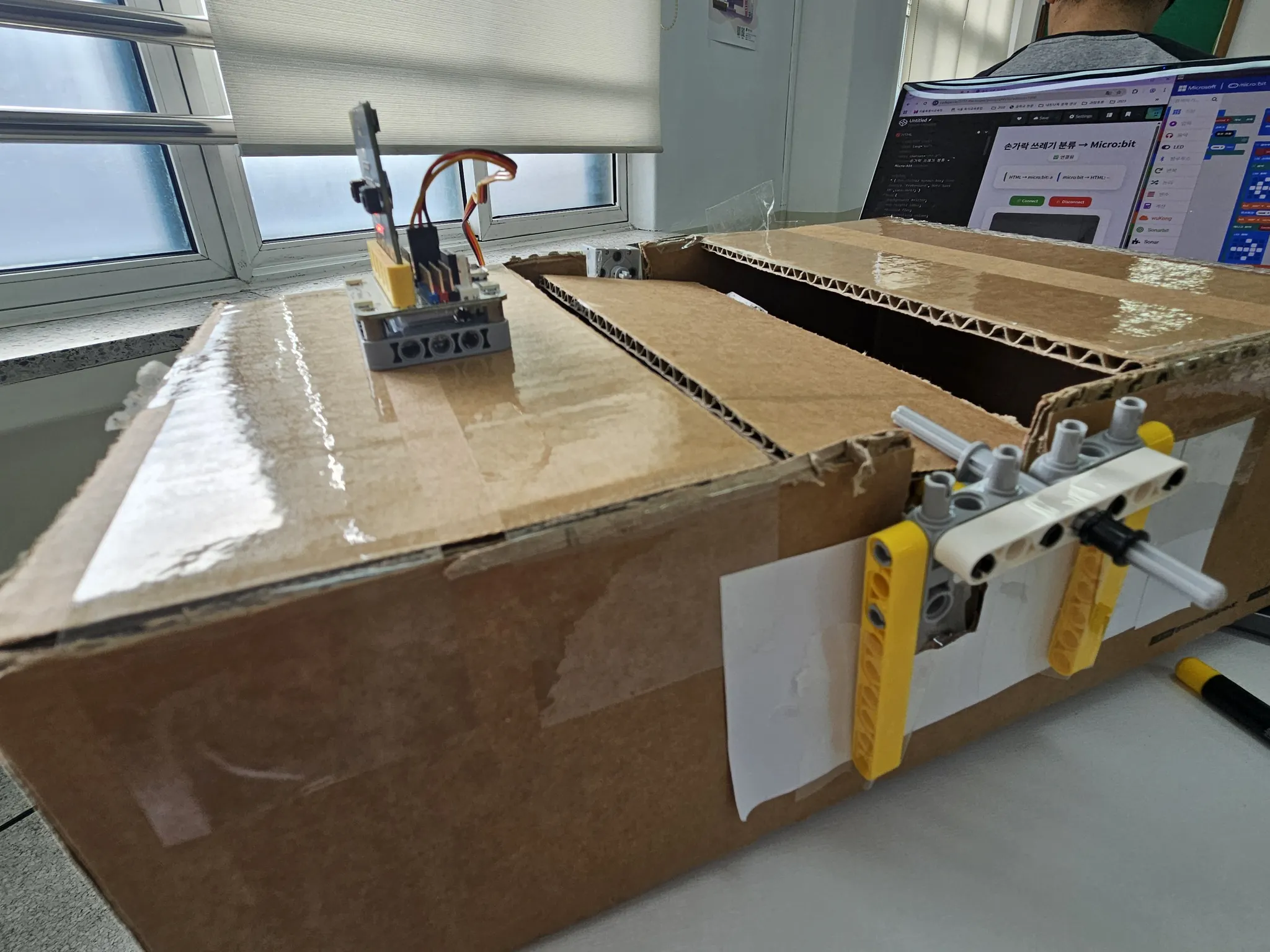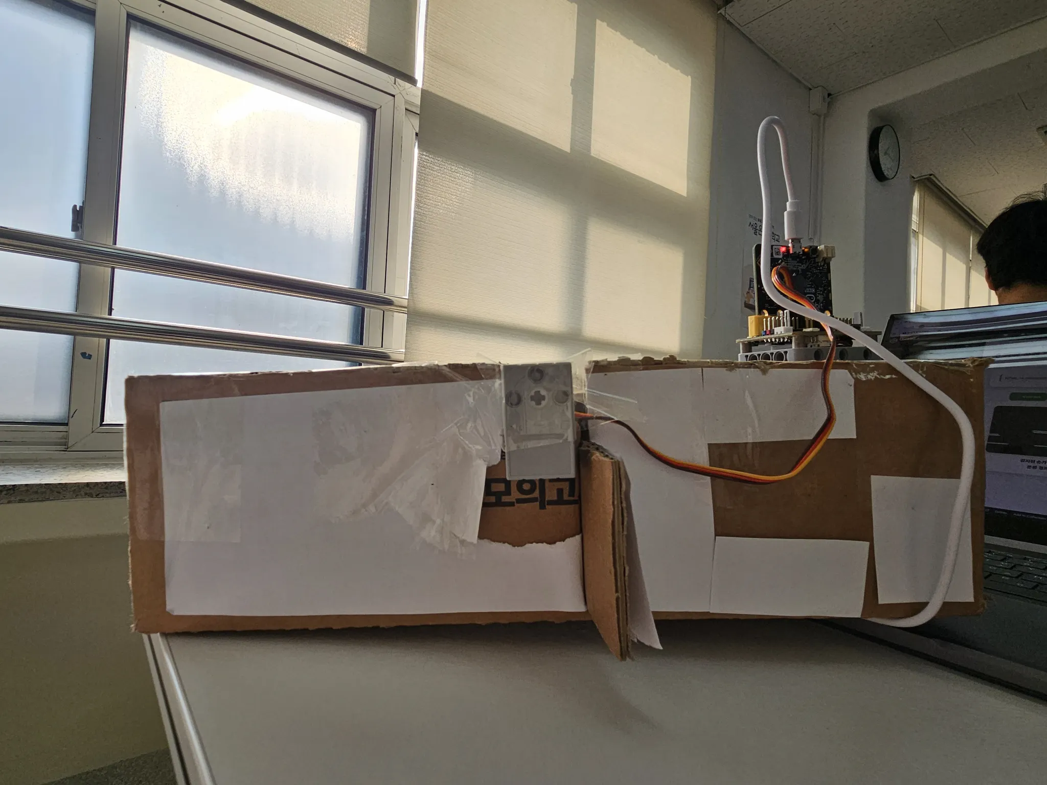 어떻게 서보모터를 고정시켜야할지, 지지대를 안정적으로 만들어야 할지 고민하는 과정도 있었다. 우선 테이프로 고정시켰는데 잘 작동하긴 했지만, 박스에 작은 구멍을 뚫어 볼트너트를 이용했으면 더 간편하고 안정적이었을 것 같다.
