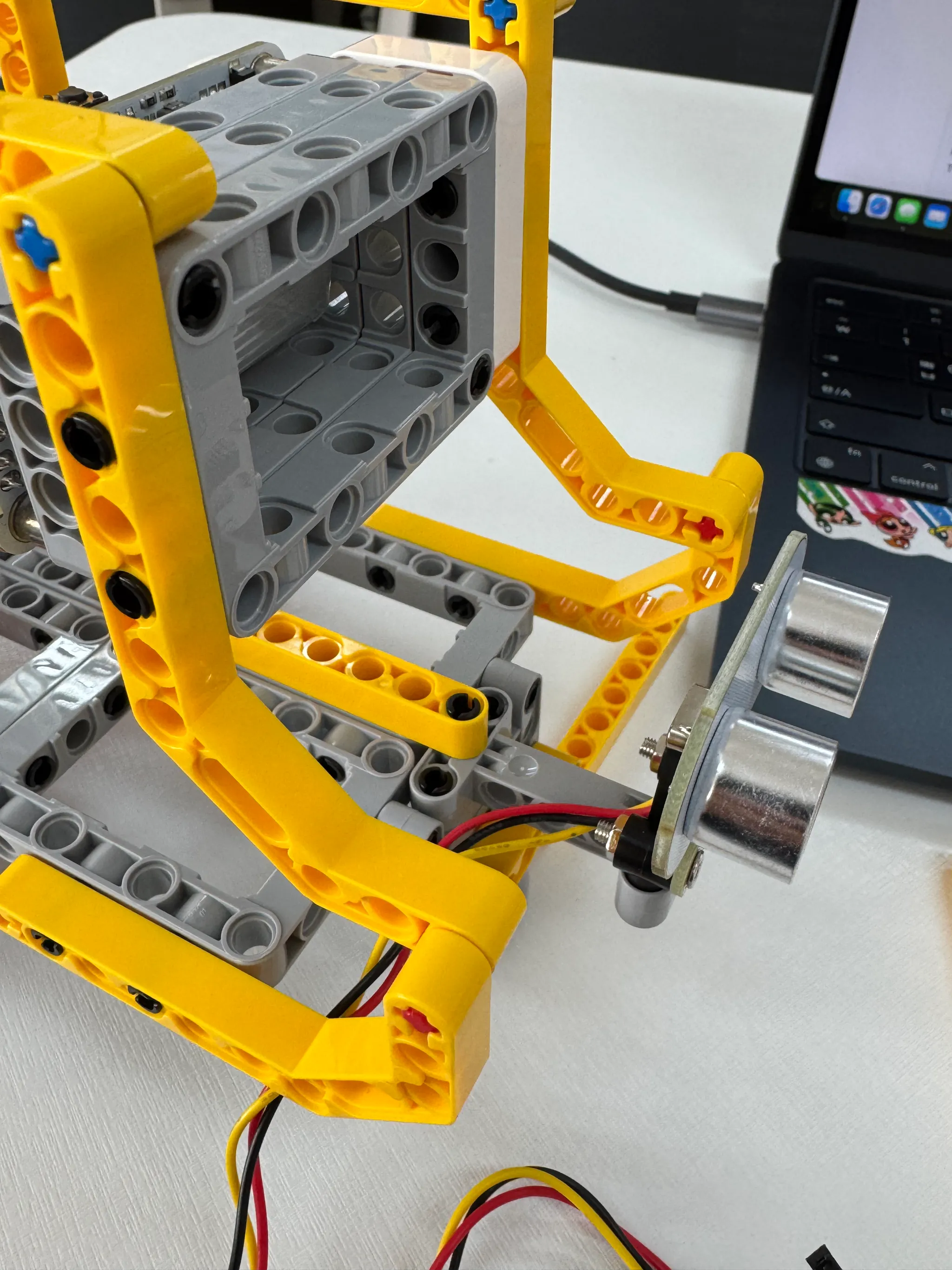 갑자기 자동차의 긴급제동이 생각나서 장애물이 앞에 존재하면 멈추게 하기 위해 센서를 추가했다. I자 레고 하나로는 불안할거같아서 노란 긴 막대로 아래의 판과 고정시켰다.