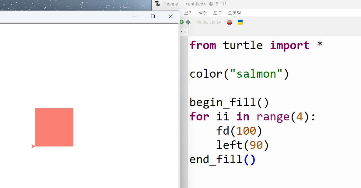 color(pencolor, fillcolor): 펜 색상과 채우기 색상을 동시에 설정