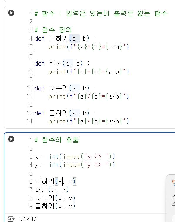 함수를 정의 할때 입력은 a, b(argument) 로 정의 했지만 실제 함수를 콜링 할때는 x, y(parameter)를 넣어주었다.