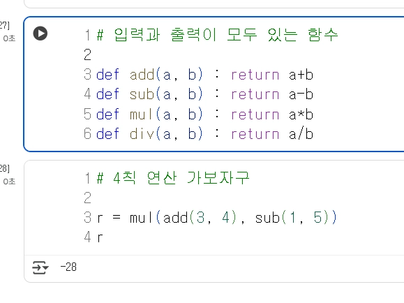 정의된 함수에서 변수를 입력하여, print() 계산 결괏값은 보여줬지만 retrun으로 반환하는 결괏값이 없기 때문에 출력이 없는 함수로 분류된다.