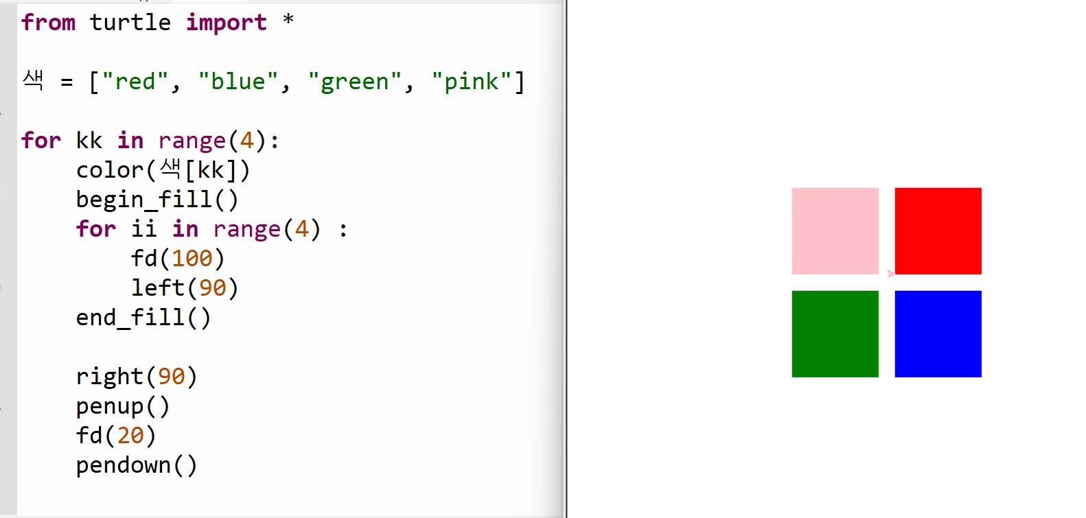 color(pencolor, fillcolor) - 펜과 채우기 색상 동시 설정