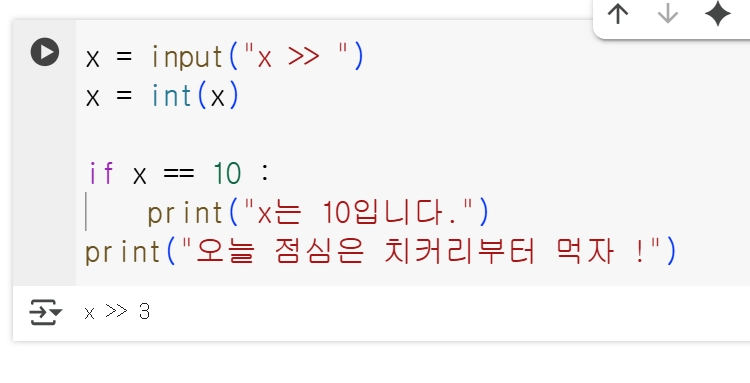 x와 10이 같으면 들여쓰기가 된 코드가 동작한다.