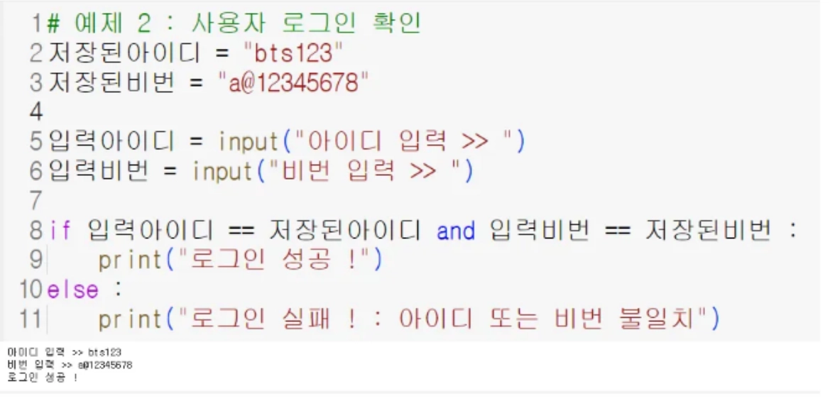 아이디 조건과 비번조건이 and로 묶여서 둘다 같을 때만 로그인 성공 이 출력된다.