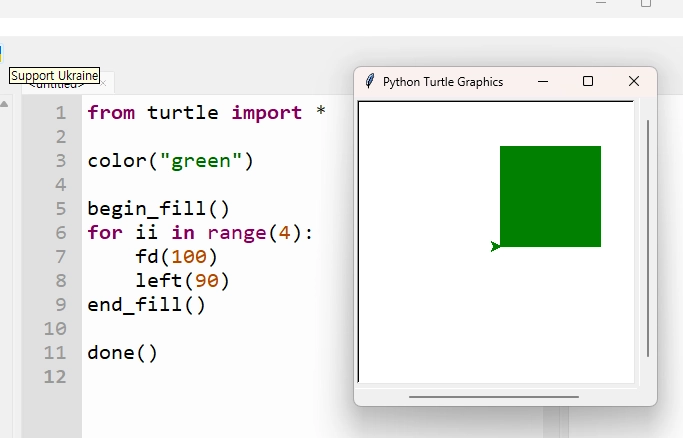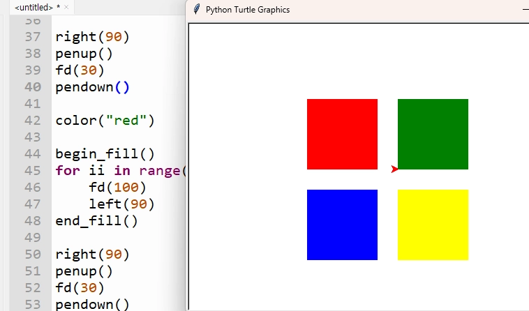 from turtle import * color("green") begin_fill()S for ii in range(4): fd(100) left(90) end_fill() right(90) penup() fd(30) pendown() color("yellow") begin_fill() for ii in range(4): fd(100) left(90) end_fill() right(90) penup() fd(30) pendown() color("blue") begin_fill() for ii in range(4): fd(100) left(90) end_fill() right(90) penup() fd(30) pendown() color("red") begin_fill() for ii in range(4): fd(100) left(90) end_fill() right(90) penup() fd(30) pendown() done()