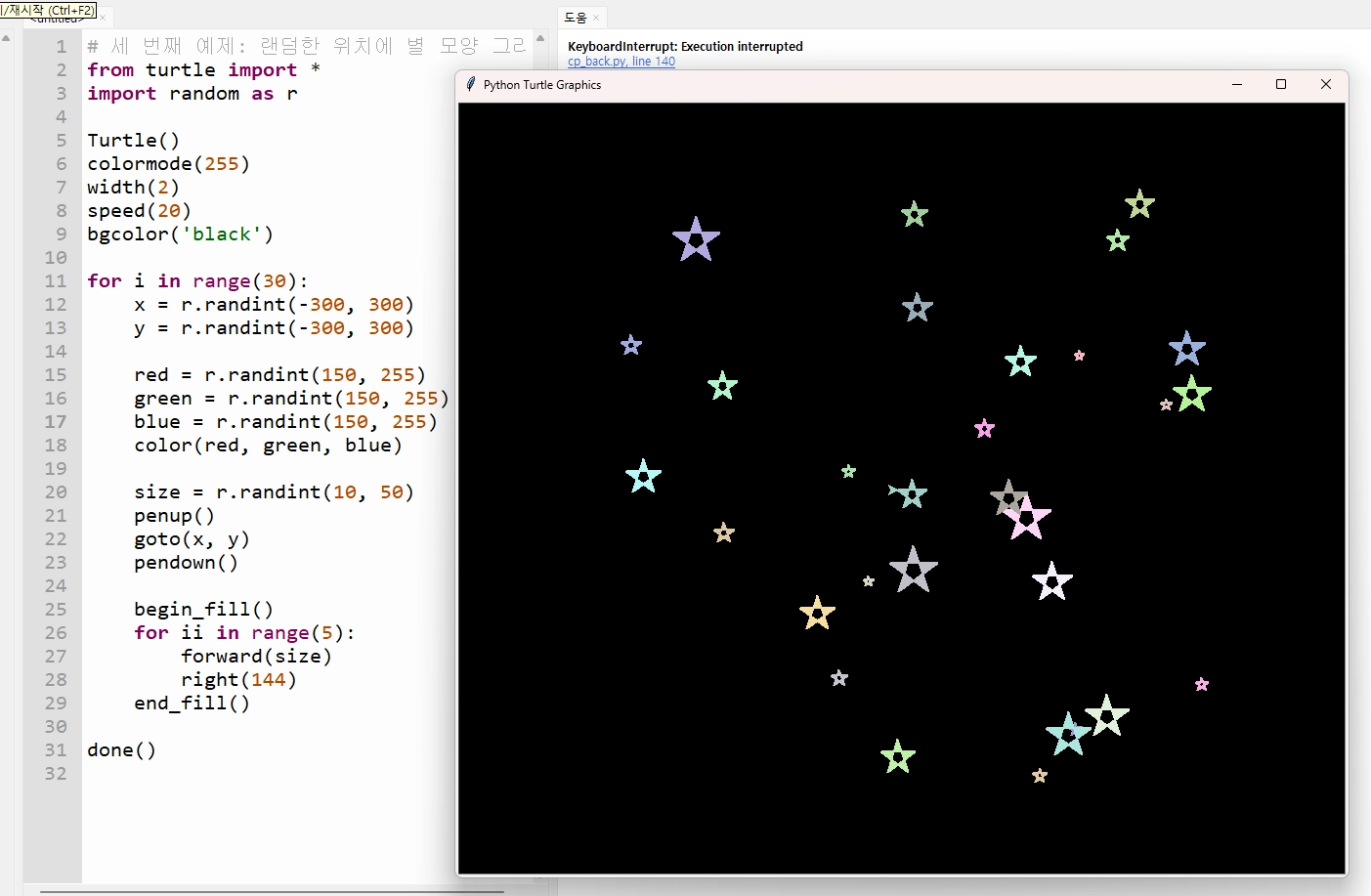 # 세 번째 예제: 랜덤한 위치에 별 모양 그리기 from turtle import * import random as r Turtle() colormode(255) width(2) speed(20) bgcolor('black') for i in range(30): x = r.randint(-300, 300) y = r.randint(-300, 300) red = r.randint(150, 255) green = r.randint(150, 255) blue = r.randint(150, 255) color(red, green, blue) size = r.randint(10, 50) penup() goto(x, y) pendown() begin_fill() for ii in range(5): forward(size) right(144) end_fill() done()