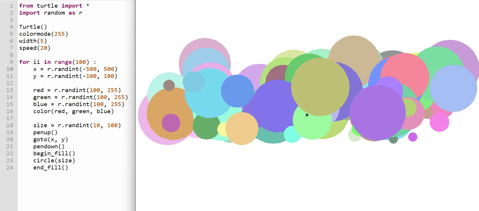 from turtle import * import random as r Turtle() colormode(255) width(5) speed(20) for ii in range(100) : x = r.randint(-400, 400) y = r.randint(-400, 400) red = r.randint(0, 255) green = r.randint(0, 255) blue = r.randint(0, 255) color(red, green, blue) size = r.randint(10, 100) penup() goto(x, y) pendown() begin_fill() circle(size) end_fill()