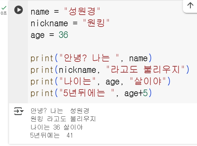 print() 구문에서 name 변수 안에 있는 “성원경” 데이터를 호출하였다.