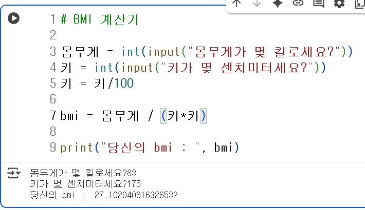 키는 cm 로 입력받고 내부적으로 100을 나눠서 m 단위로 바꿈