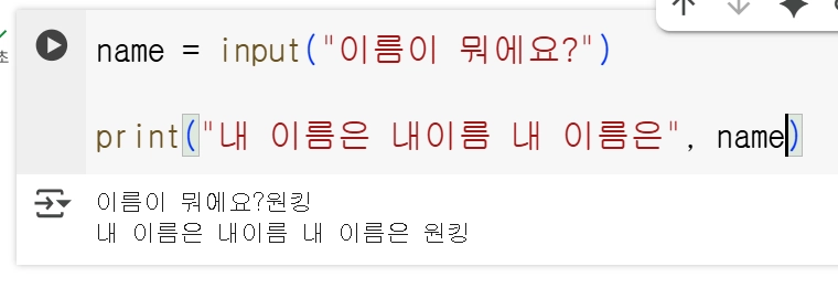 name이란 변수에 input() 함수로 이름을 넣어서 print()함수에서 변수의 데이터를 출력하였다.